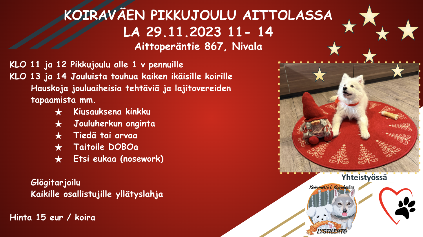 Virittäydy joulutunnelmaan ja tule meille viettämään koirasi kanssa pikkujoulua. Luvassa on mukavaa tekemistä ohjatusti.